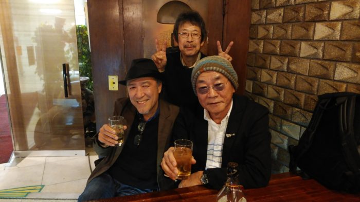 カラオケ教室の生徒さんと南森町で忘年会をした後、ふらりと立ち寄ったマヅラで、久しぶりにシンガーソングライターの寺人とばったり出会いました。今年も大活躍の彼でしたが、彼のライブにはなかなかお邪魔できませんでした。知人が先ごろ始めたFM宝塚の番組に彼の歌をオンエアしてもらうため、彼のCDを3枚預かりました。来年はどこかで彼とのジョイント・ライブができればいいのですが。(後ろはマヅラのチーフ永井さん)