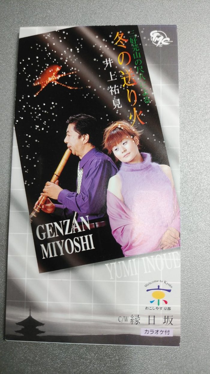 1999.9月に、京都の尺八名人三好元山先生と歌手井上祐見のコラボで歌が生まれました。作詞国谷幸生、作曲藤山節雄。「冬の送り火」は、例年は夏に行われる京都五山の送り火が、20世紀最後の1999年の大晦日にも開催され、そのイベントをテーマに創作されました。