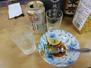 夕方になり練習に疲れ、長年通うなじみの立ち飲み屋で軽く一杯。
